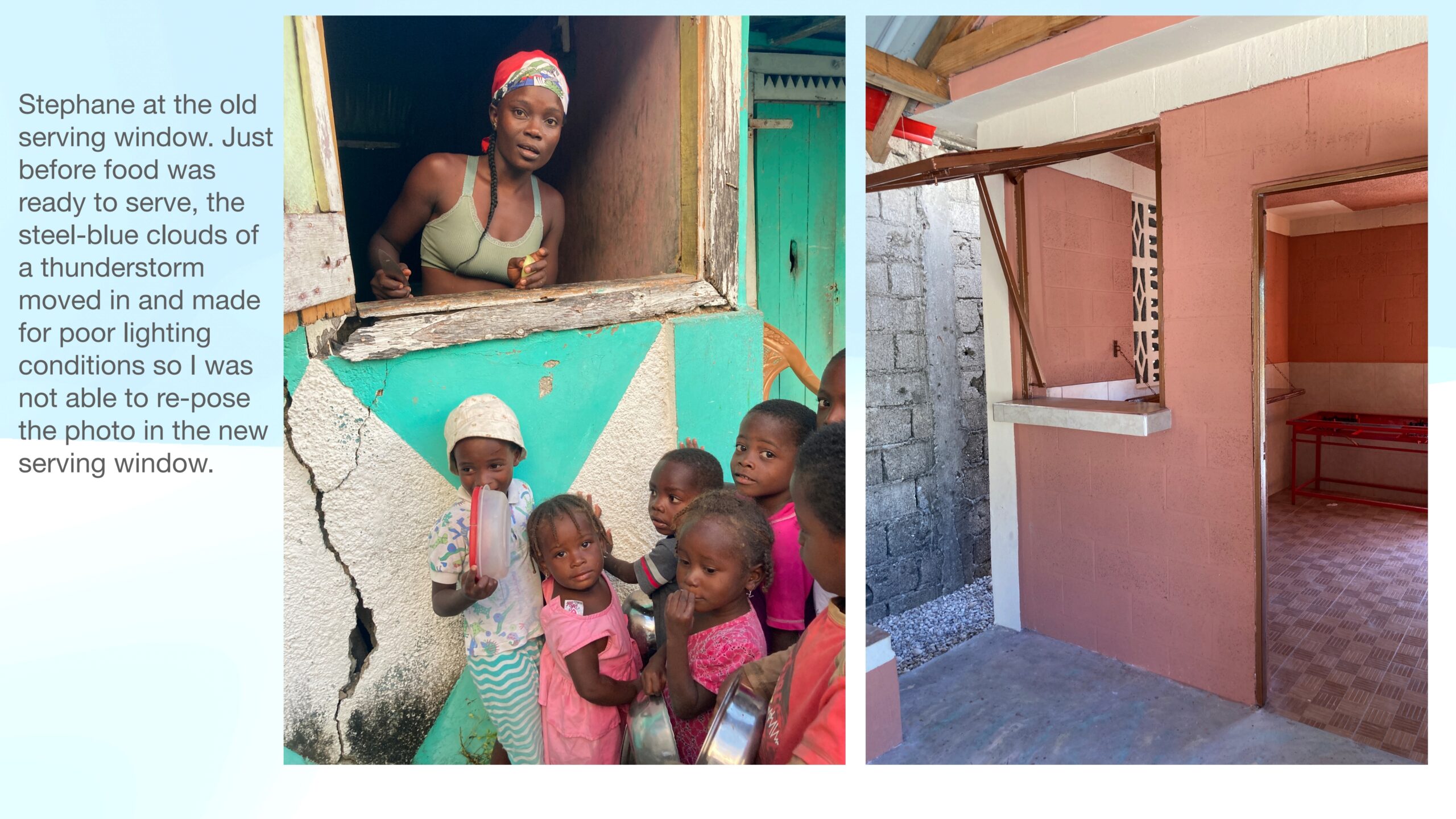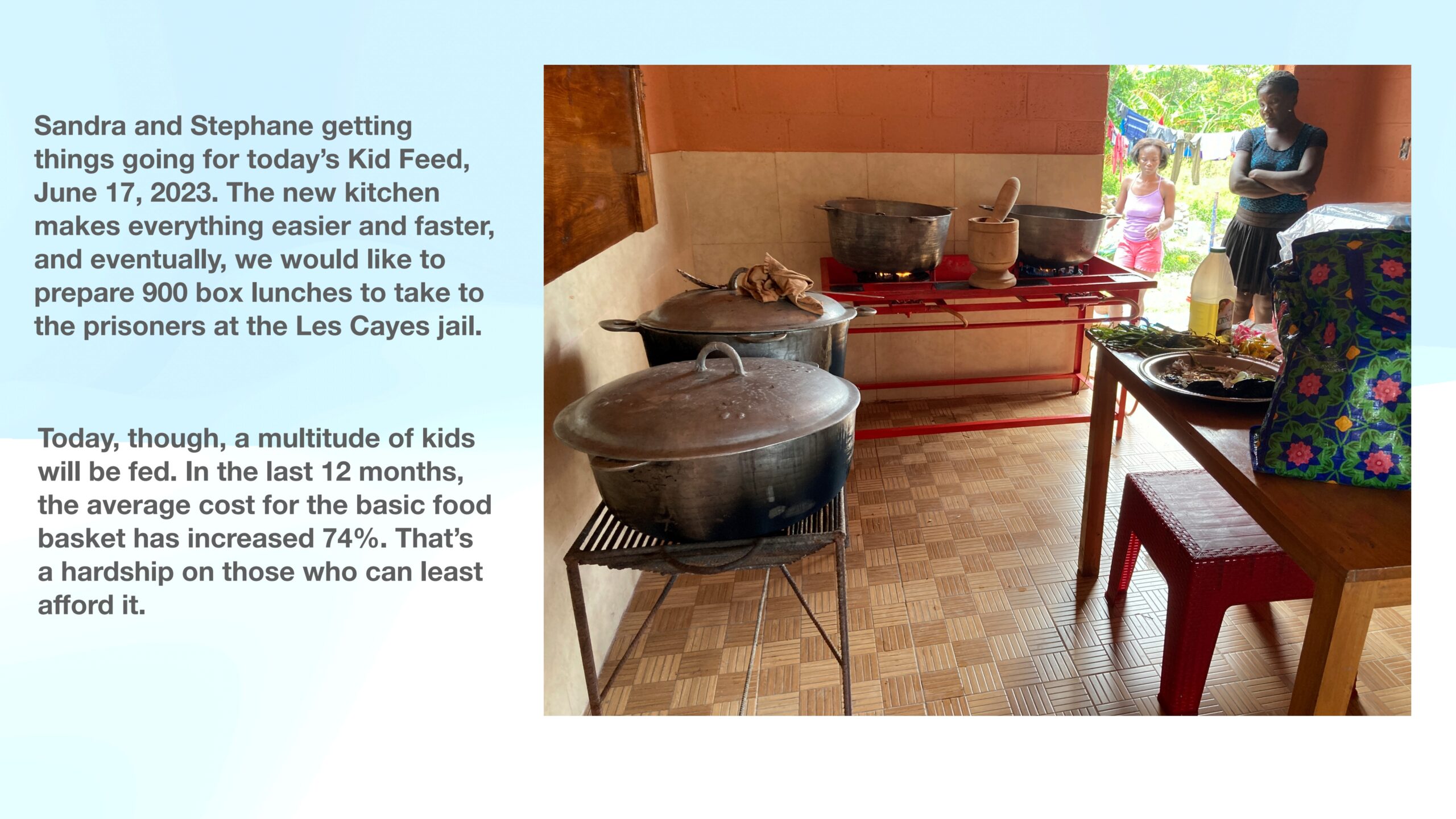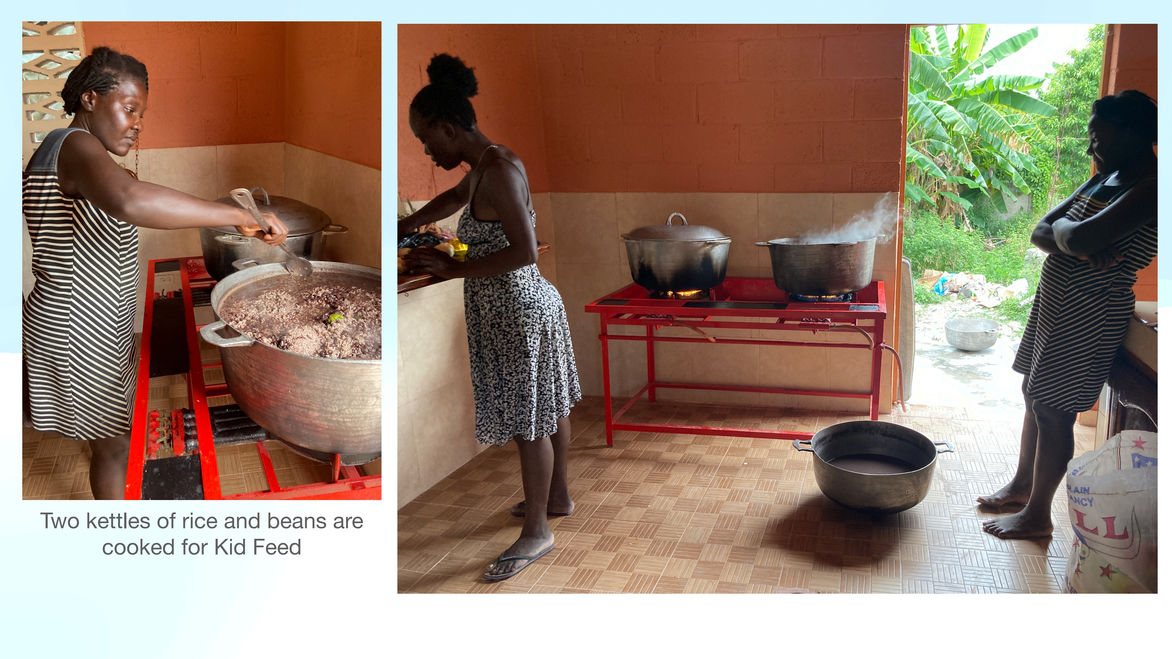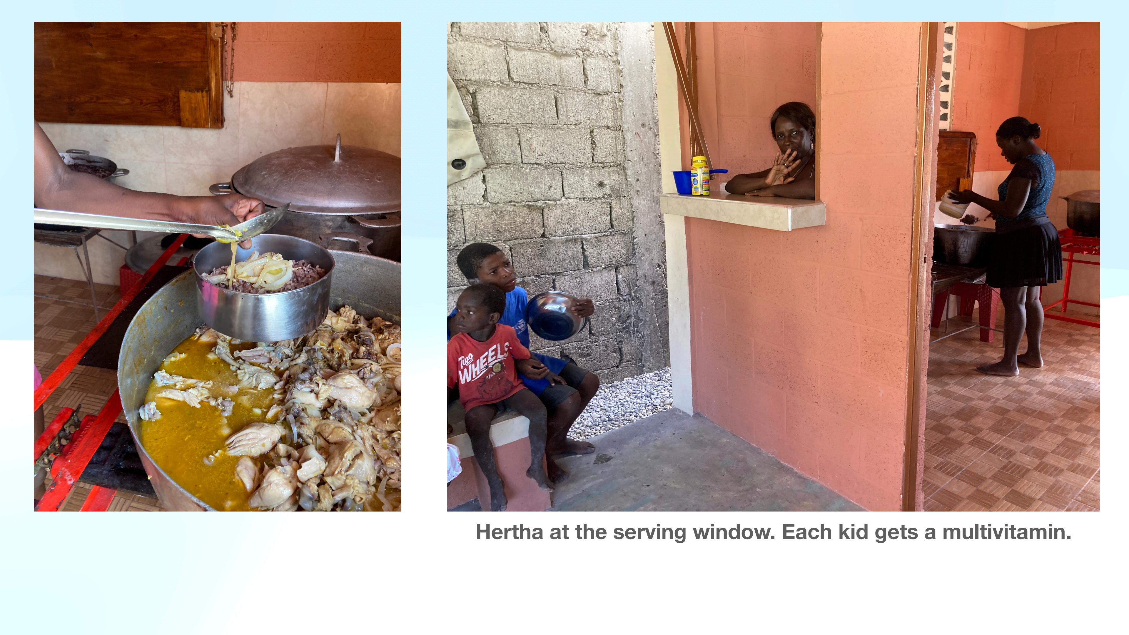 I remember watching the TV series Rin Tin Tin back when I was a lad. I don’t remember much, except that many episodes ended with the sound of the bugle and the cavalry galloping in just in time to save the day. I think I had a naive expectation that an intervening international force could charge into Port-au- Prince, eliminate the gangs and open the streets and highways so that needed fuel, food, and medicine could be delivered. It doesn’t appear that anything like that will happen. It’s all too complicated. No one can predict when schools will be able to reopen. In a conversation with the provost of AUC yesterday, I said it is a tragedy for students to be out of school so long, then the provost said that it is a catastrophe. I am heartsick seeing what is happening in Haiti. But we were able to do a Kid Feed in Sou Wòch yesterday. My mason-crew boss has been learning how to use a design tool on his laptop, and he came up with this rendering with input from Hertha, me and others. He figures that the total cost for demolition and rebuilding the old house of Madam Elvie will be around $ 30,000.00 (Cook House Project). The expanded kitchen could then be used for more than Kid Feed and be a benefit to the community. After buying what we needed for yesterday’s Kid Feed, Hertha told me that prices were still going up and the availability of food was going down—less food for higher price. For many Haitians, the situation is grim and approaching dire. Again, a big THANK YOU! to those of you who are contributing to Kid Feed.